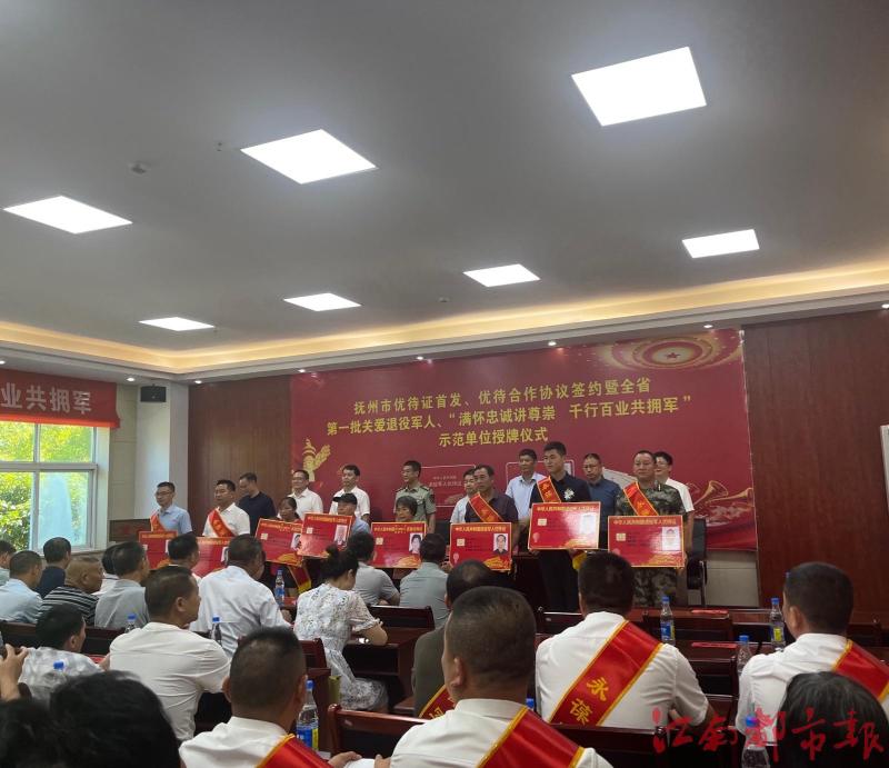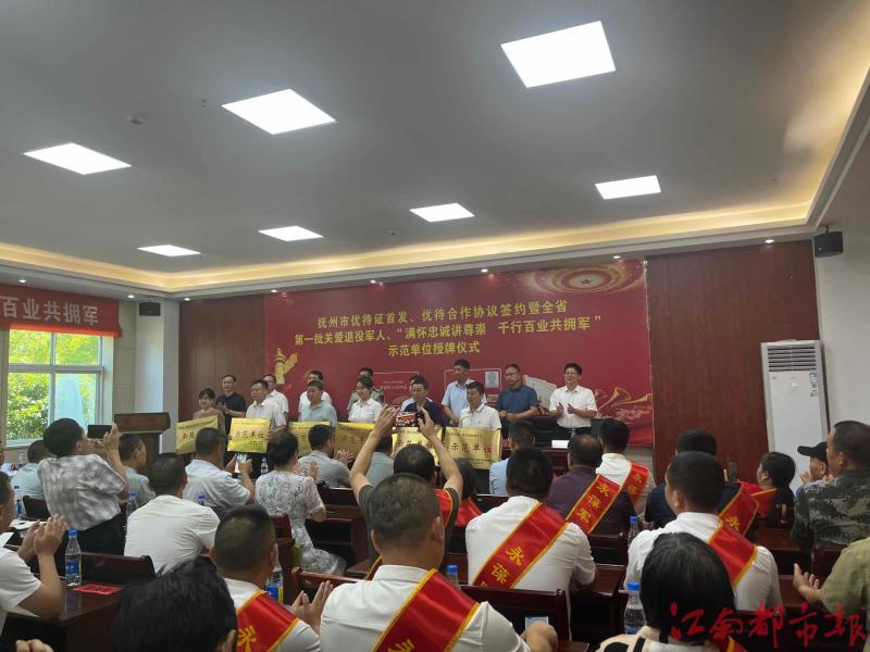 江南都市報(bào)訊 揭賓耀 全媒體記者舒曉燕攝影報(bào)道:9日上午,撫州市優(yōu)待證首發(fā)、優(yōu)待合作協(xié)儀簽約暨第一批關(guān)愛(ài)退役軍人示范單位授牌儀式活動(dòng)舉行,為全省首批4家“滿懷忠誠(chéng)講尊崇 千行百業(yè)共擁軍”示范單位,2家省級(jí)關(guān)愛(ài)退役軍人示范單位授牌,為退役軍人和其他優(yōu)撫對(duì)象代表發(fā)放優(yōu)待證。撫州市文廣新旅局、撫州市教育體育局等12家優(yōu)待合作單位簽訂優(yōu)待項(xiàng)目協(xié)議。