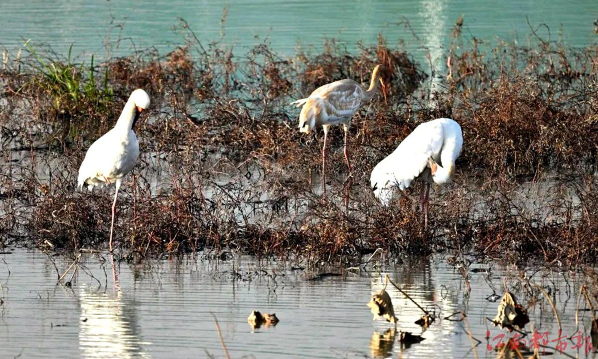 江南都市報(bào)訊 全媒體記者許南平攝影報(bào)道:12月21日,江西鄱陽湖國家級(jí)自然保護(hù)區(qū)管理局科研人員王小龍?jiān)诘靥幹袊蝤B小鎮(zhèn)的永修吳城鎮(zhèn)鄱陽湖生態(tài)濕地公園科考中,驚喜發(fā)現(xiàn)3只白鶴棲息濕地公園內(nèi)。這是鄱陽湖生態(tài)濕地公園2021年建立以來,首次監(jiān)測(cè)到野生白鶴。白鶴是世界極危物種,被列入《世界自然保護(hù)聯(lián)盟》(IUCN)極危物種。目前全球僅存4000余只,其中每年約98%在鄱陽湖越冬。白鶴棲息于開闊平原沼澤草地、苔原沼澤和大的湖泊巖邊及淺水沼澤地帶。其主要以苦草、眼子菜、苔草、荸薺等植物的莖和塊根為食,也吃水生植物的葉、嫩芽和少量蚌、螺等軟體動(dòng)物、昆蟲、甲殼動(dòng)物等動(dòng)物性食物。白鶴是一種冬候鳥,每年六至八月在俄羅斯境內(nèi)的西伯利亞繁殖,九十月在中國東北吉林境內(nèi)的莫莫格濕地停歇一個(gè)月左右,再啟程南下至江西鄱陽湖越冬,翌年3月中下旬開始遷飛回北方。