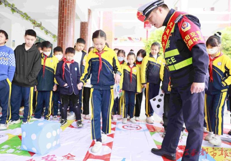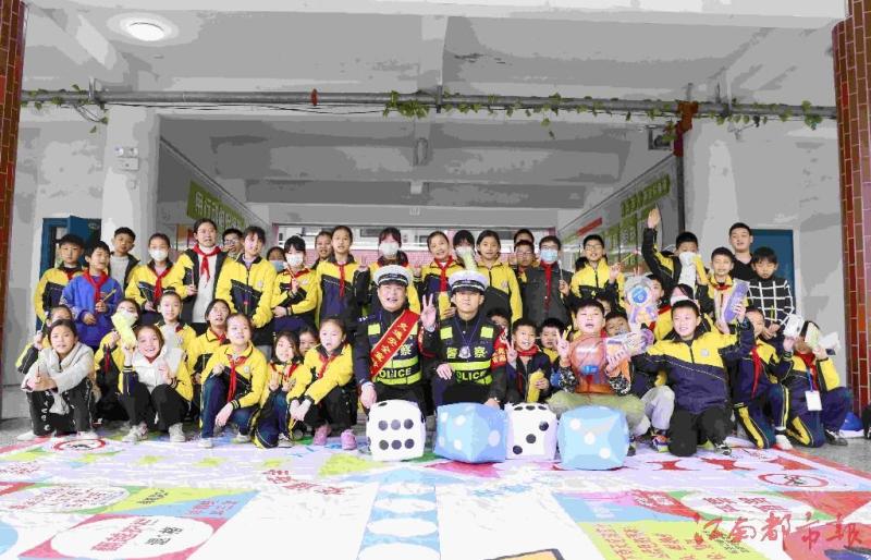 孩子們的聽課積極性空前高漲。學(xué)習(xí)完交通安全知識后,他們隨著民警來到游戲的活動現(xiàn)場,一幅巨大的交通安全“飛行棋”擺在過道上,由小學(xué)生扮成的“棋子”穿行其間,場邊不時傳來同學(xué)們的加油助威聲。民警們還根據(jù)棋盤上的提示,對“棋子”們進行講解交通規(guī)則,教他們辨認交通標(biāo)志。在游戲中,枯燥的交通安全知識變得活潑有趣,寓教于樂。孩子們玩得開心,交通知識“入腦入心”,讓他們對于交通安全的理解更加深刻。