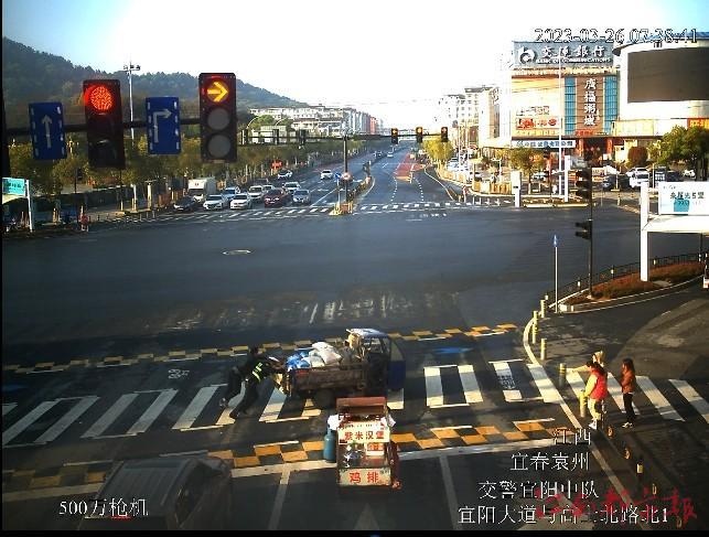 江南都市報(bào)訊 全媒體記者胡琴攝影報(bào)道:近日,在宜春市宜陽(yáng)大道與高士北路紅綠燈下,一輛三輪車因故障“拋錨”,將后面的小車全部堵住,無(wú)法通行。執(zhí)勤交警劉剛當(dāng)機(jī)立斷,立即和熱心市民將三輪車推離路口,挪至安全地點(diǎn),一分鐘內(nèi)解除了安全隱患,疏通了道路。