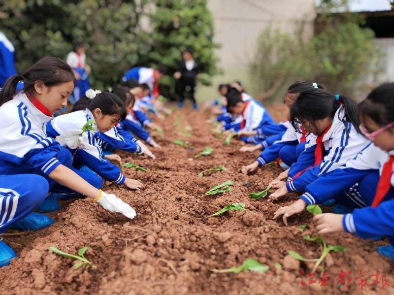 校園內(nèi),大家在老師的指導下或鋤地,或挖坑或栽苗,或澆灌。他們不怕臟、不怕累,個個干勁十足,在自己的“一畝三分地”幸福耕耘著,臉上洋溢著希望與喜悅。