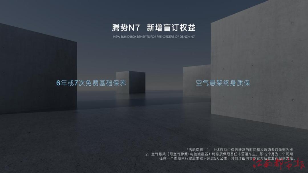 為了給騰勢N7的首批用戶們帶來更多福利,在四大豪華專屬權(quán)益基礎(chǔ)上,騰勢N7新增部分盲訂權(quán)益——即日起下訂騰勢N7將獲得價(jià)值6000元6年或7次免費(fèi)基礎(chǔ)保養(yǎng),以及空氣懸架終身質(zhì)保。趙長江也在現(xiàn)場公布了騰勢N7的產(chǎn)品節(jié)奏,6月中旬可前往門店實(shí)車體驗(yàn)、下旬上市大定,7-8月正式開啟N7交付。