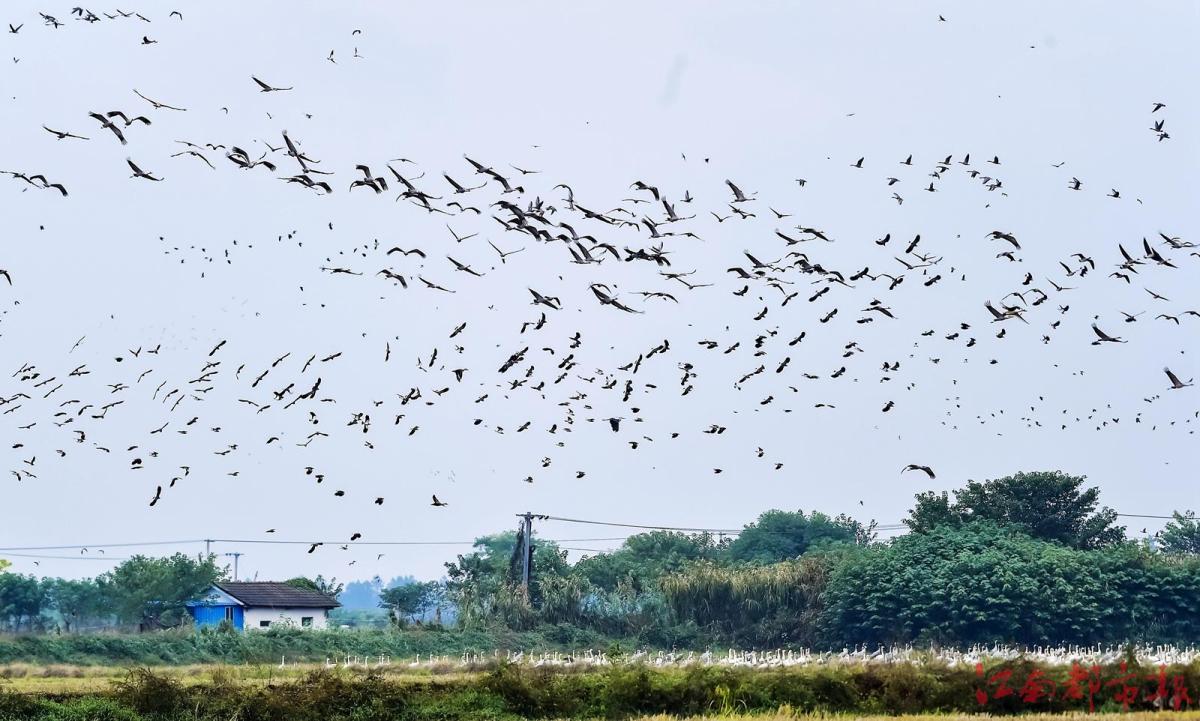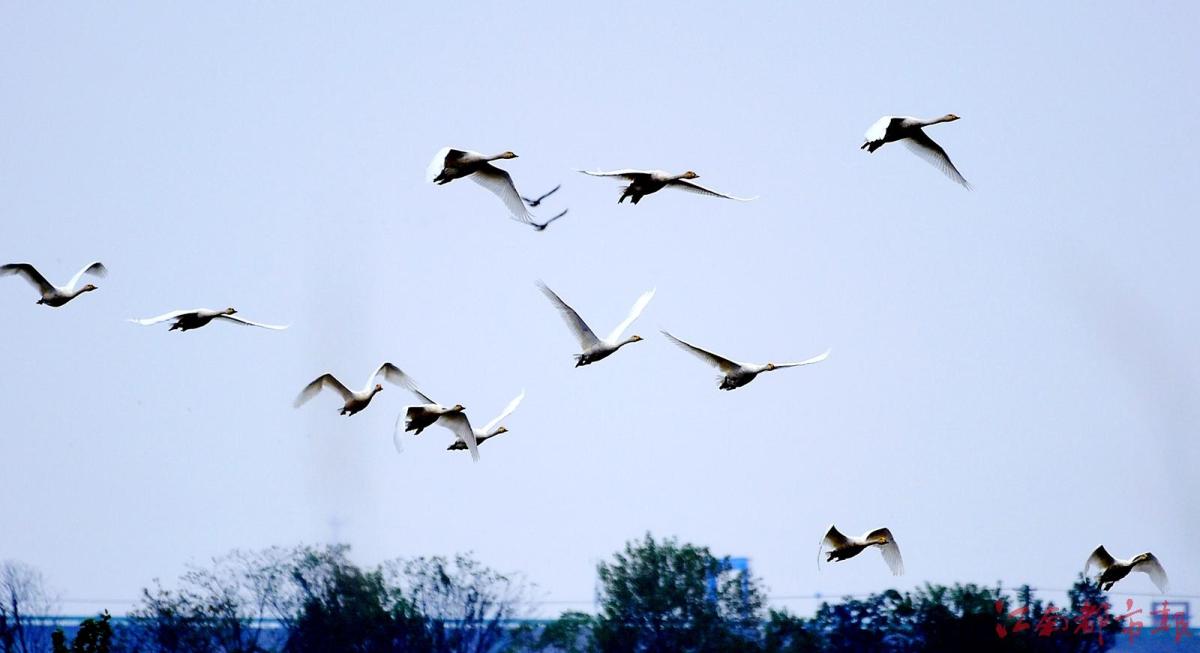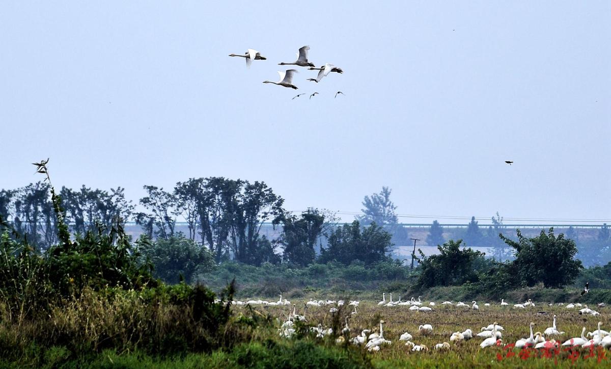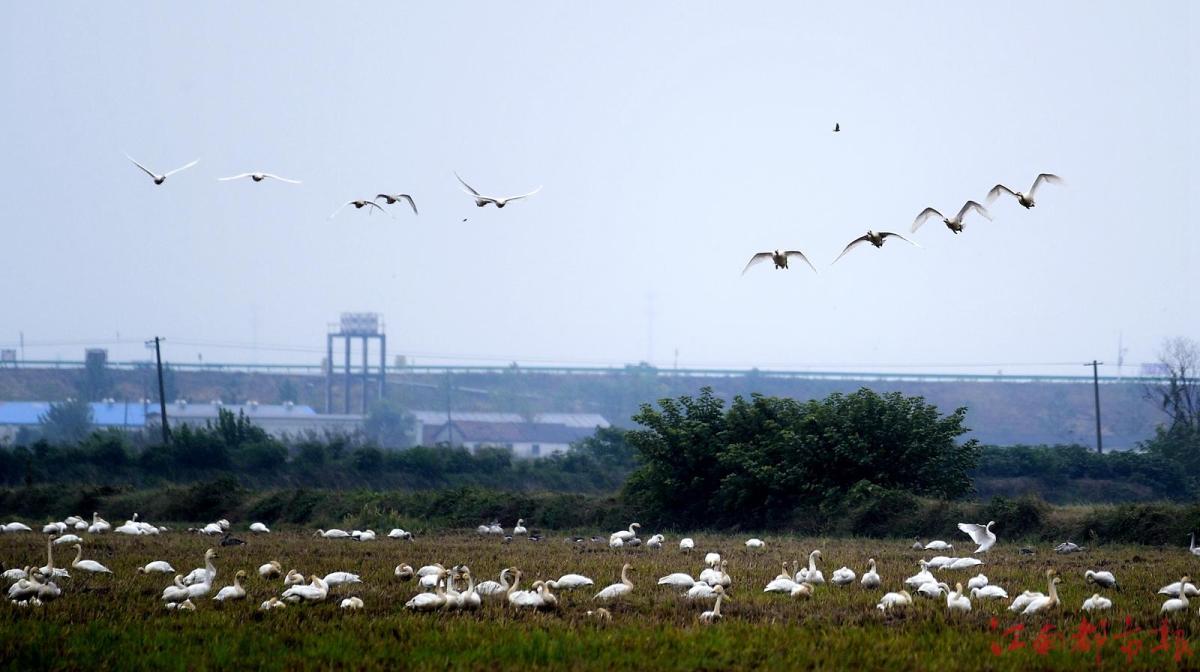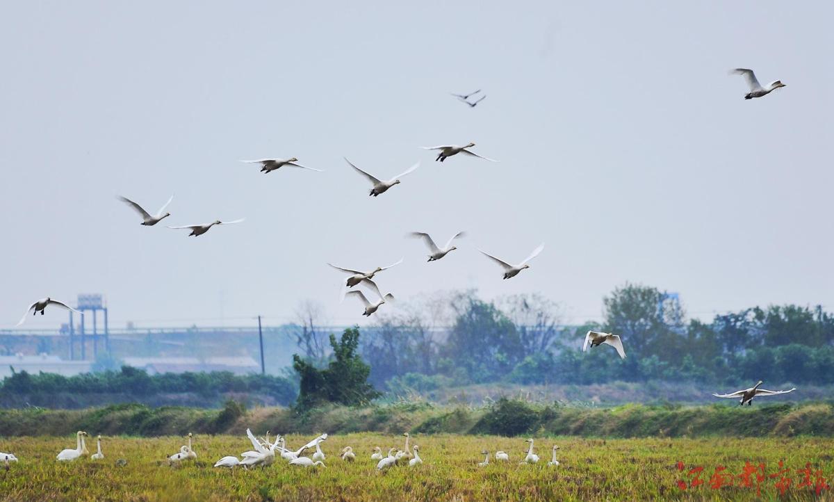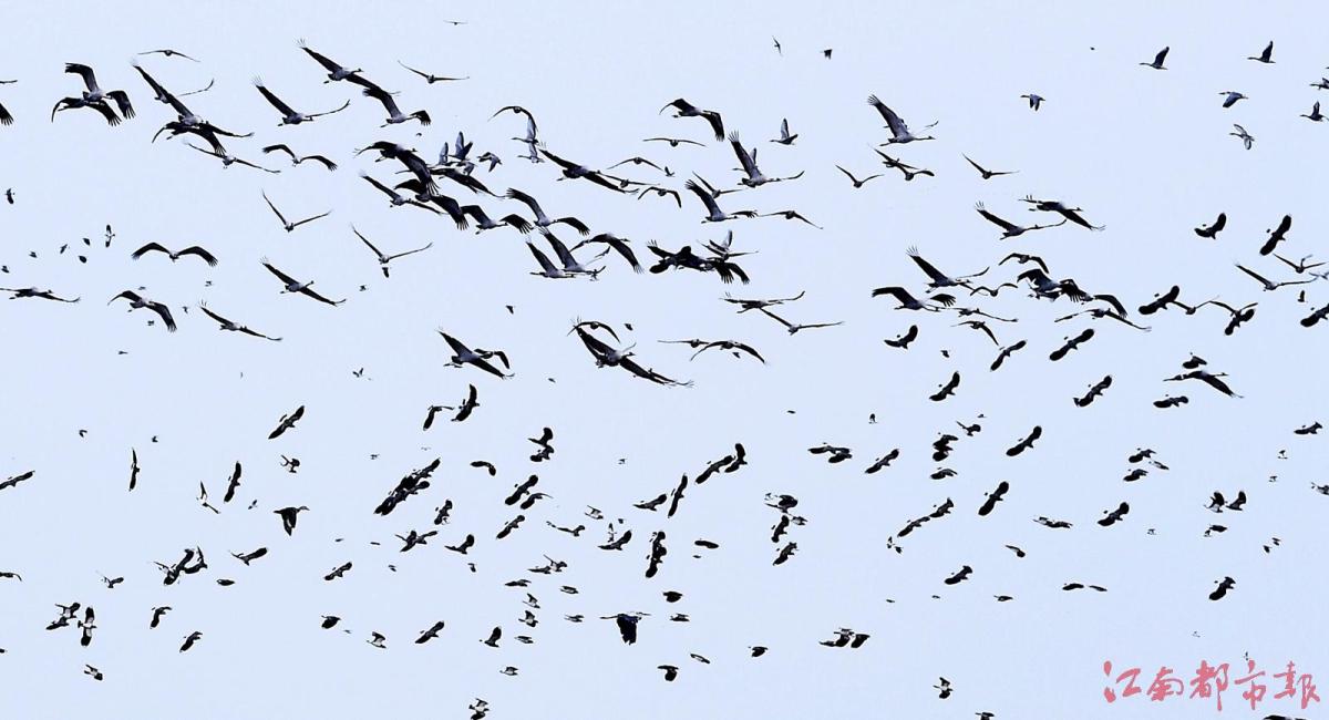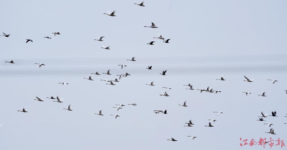 江南都市報訊 全媒體記者許南平攝影報道:11月13日,隨著氣溫逐漸下降,大批候鳥飛抵江西鄱陽湖越冬。當日,在南昌市高新區(qū)五星墾殖場管理處湘子口圩堤內(nèi)外的湖灘和稻田里,成群結(jié)隊的白鶴、大雁、小天鵝、灰鶴等越冬候鳥在湖區(qū)翩翩起舞、覓食,成為鄱陽湖區(qū)一道特別的風景。清脆歡快的鳥語聲不時飄蕩在廣袤的田野和天空,呈現(xiàn)出一派人與自然和諧共生的美麗畫卷。 鄱陽湖是中國第一大淡水湖,也是國際重要濕地、亞洲最大的越冬候鳥棲息地,被譽為“候鳥天堂”,每年秋冬季節(jié),數(shù)十萬只越冬候鳥遷徙至鄱陽湖越冬。