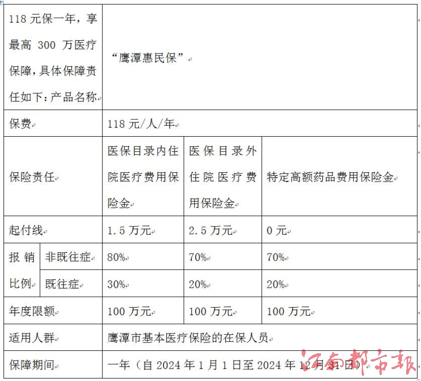據(jù)悉,“鷹潭惠民保”上線啟動(dòng)“鷹潭惠民保”由鷹潭市醫(yī)療保障局指導(dǎo),國(guó)家金融監(jiān)督管理總局鷹潭監(jiān)管分局監(jiān)督,鷹潭市人保財(cái)險(xiǎn)聯(lián)合5家共保單位共同承保。產(chǎn)品專為鷹潭定制、緊密銜接基本醫(yī)療保險(xiǎn),以普惠價(jià)格為基本醫(yī)療保險(xiǎn)參保人員提供百萬(wàn)級(jí)醫(yī)療保障和便民化健康服務(wù),具有“低門檻、低保費(fèi)、高保額”的惠民特點(diǎn)。鷹潭市城鎮(zhèn)職工和城鄉(xiāng)居民基本醫(yī)保參保人都可參保,保費(fèi)為118元/人/年,保額300萬(wàn)元,保障涵蓋基本醫(yī)保目錄內(nèi)、外住院醫(yī)療費(fèi)用保險(xiǎn)金、特定高額藥品費(fèi)用保險(xiǎn)金,醫(yī)保報(bào)完還能報(bào),進(jìn)一步減輕參保人的醫(yī)療費(fèi)用負(fù)擔(dān)。同時(shí),“鷹潭惠民保”支持使用鷹潭市城鎮(zhèn)職工醫(yī)保個(gè)人賬戶余額為本人、配偶、父母、子女繳費(fèi)參保。