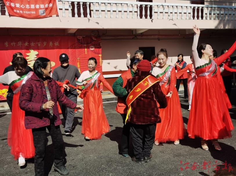 除此外,在活動現(xiàn)場還有一系列精彩紛呈的節(jié)目表演。志愿者們首先用舞蹈《袁州人民心向黨》拉開表演的序幕,《生日歌》、《最美的歌兒唱給媽媽》、《人間煙火》、《祝福祖國》等一系列精彩節(jié)目將壽宴氣氛推向高潮,最后大家和今天的壽星百歲老人李竹華奶奶共同扭起了秧歌,活動現(xiàn)場歡聲笑語、溫馨濃郁的氛圍匯成一片幸福海洋。