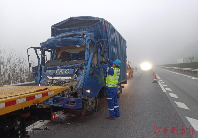 江南都市報訊 蔣曉芬、全媒體記者劉火兵攝影報道:1月4日, 一輛小型貨車行駛在寧定高速寧都方向時,司機因大霧天氣視線受阻剎車不及時,導致追尾前方貨車。省交投贛州管理中心贛州車輛救援大隊接到救援電話后,第一時間趕往現(xiàn)場救援,確保了道路暢通。