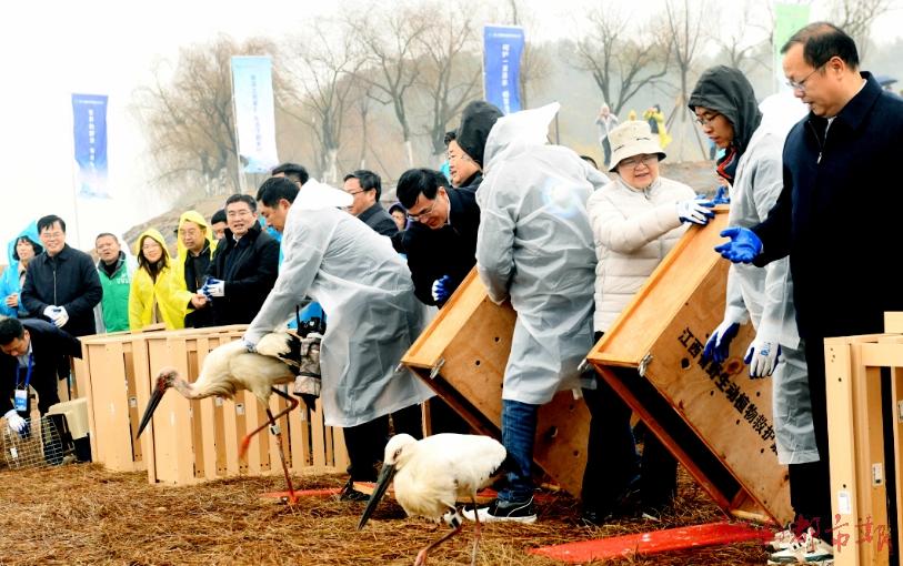 江南都市報訊 全媒體記者許南平攝影報道:1月10日,記者從省林業(yè)局獲悉,第三屆鄱陽湖國際觀鳥季“鶴舞鄱湖·人與自然和諧共生”萬人簽名暨上饒分會場活動在鄱陽湖贛劇院正式啟動?;顒悠陂g,大家共同參觀了“鶴舞鄱湖”攝影展和林產(chǎn)品展銷會,并前往鄱陽湖國家濕地公園參加救護(hù)候鳥放飛儀式暨高空觀鳥活動。當(dāng)天,包括來自東北相關(guān)部門委托放飛的共計25只經(jīng)過專業(yè)人員救治、飼養(yǎng)已達(dá)到放歸野外標(biāo)準(zhǔn)的東方白鸛、白天鵝、鴻雁等國家級野生保護(hù)的候鳥被集中放飛。據(jù)了解,鄱陽湖作為中國最大的淡水湖,是亞洲最大的候鳥越冬棲息地,每年吸引60萬-70萬只候鳥在此越冬,記錄鳥類460余種,其中白鶴占全球種群數(shù)量的95%以上,是名副其實的“白鶴王國”“候鳥天堂”。良好的生態(tài)和種類豐富的候鳥吸引了眾多的游客前來觀鳥打卡。