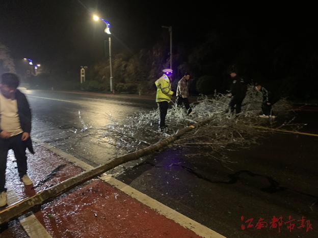 江南都市報訊 葉歐、全媒體記者陳建新攝影報道:2月24日晚上11時,在武功山景區(qū)小佛嶺路段,武功山交警執(zhí)勤警力發(fā)現(xiàn)有大樹倒塌影響道路通行,立即組織警力進行清除。