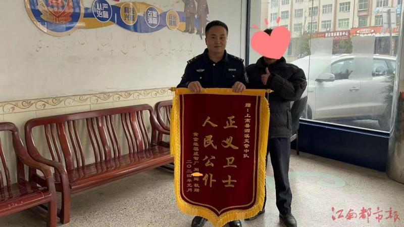 2月27日,上高縣公安局交通警察大隊(duì)泗溪中隊(duì)辦事大廳內(nèi),傷者家屬將一面錦旗送到民警彭小飛手上,向他表示感謝。