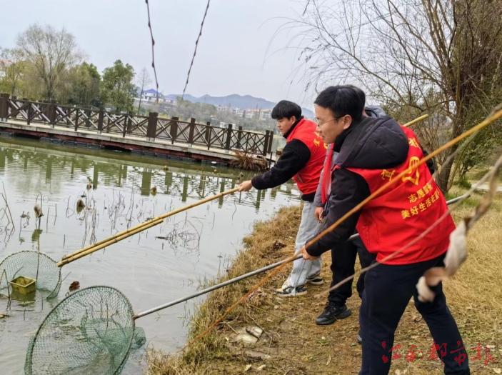 志愿者們身穿志愿者服裝,準(zhǔn)時(shí)來到新昌濕地公園,簡單分工布置后,大家立即開始忙碌起來。垃圾清理組伸出長長的網(wǎng)兜,正打撈公園人工湖湖面白色垃圾和浮游物品。