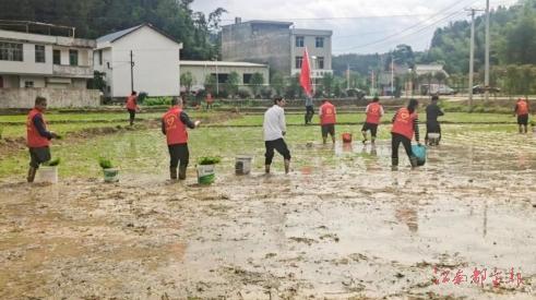 4月19日,該鄉(xiāng)組織了一支由30余名黨員組成的春耕生產(chǎn)志愿服務(wù)隊(duì),他們?cè)缭绲貋?lái)到板倉(cāng)村茶遼彎小組,挽起袖子,卷起褲腿,在水田里插下一行行秧苗,另一小組則在承諾種植的旱地上種下了一壟壟玉米。當(dāng)日,該鄉(xiāng)完成承諾新增耕地種植面積約8畝。