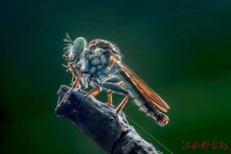 如生活中十分招人討厭的蒼蠅,在鄭明輝的微距攝影下,讓人看到蒼蠅身體的顏色極為絢麗,尤其是突出的眼睛很是酷炫。那一只站立的蒼蠅仿佛叉著腰,好似亭亭玉立的婀娜女子將要翩翩起舞,又隱隱透出一股英氣。如此美麗的景象讓人忍不住贊嘆,也對神秘的昆蟲世界帶來無窮的想象。