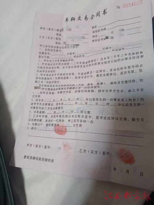 楊先生告訴記者,今年2月初,他將名下一輛東風(fēng)日產(chǎn)牌汽車掛在“瓜子賣車”小程序上出售,信息掛出去后,有多個(gè)二手車商家聯(lián)系他。2月8日,一名自稱為南昌平民車汽車銷售有限公司的工作人員聯(lián)系上他,在上門驗(yàn)車后,愿意出3.8萬(wàn)元收購(gòu)他的車,但是在簽合同期間,楊先生又接到另外一家二手車商家的電話,稱可以4.1萬(wàn)元的價(jià)格購(gòu)買他的車輛。