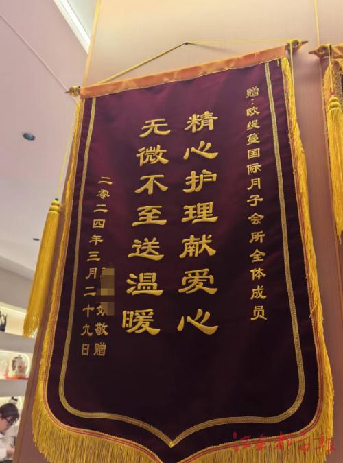 在會(huì)所的二樓,記者看到了滿墻的錦旗,想拍照被工作人員攔了下來,很多錦旗上面的落款日期是2024年4月、5月、6月,這與劉娟所說的會(huì)所在2024年10月31日之前沒有接待寶媽的說法相矛盾。對(duì)此,劉娟解釋說,這些錦旗都是他們自己制作的。