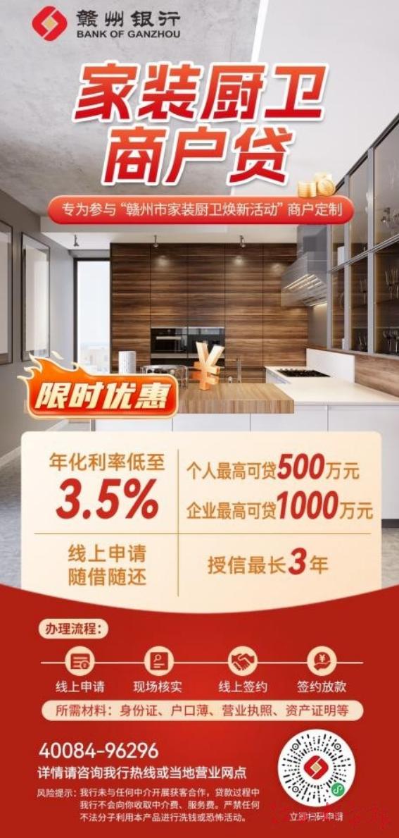 針對參加“2025年贛州市家裝廚衛(wèi)煥新活動”的商戶群體,贛州銀行量身定制了“家裝商戶貸”專屬金融產(chǎn)品。該產(chǎn)品支持信用、保證、抵押等多元擔保方式,利率最低可至3.5%,充分滿足商戶在采購新型家裝廚衛(wèi)產(chǎn)品、店面裝修升級、拓展業(yè)務規(guī)模等經(jīng)營周轉(zhuǎn)環(huán)節(jié)的資金需求。