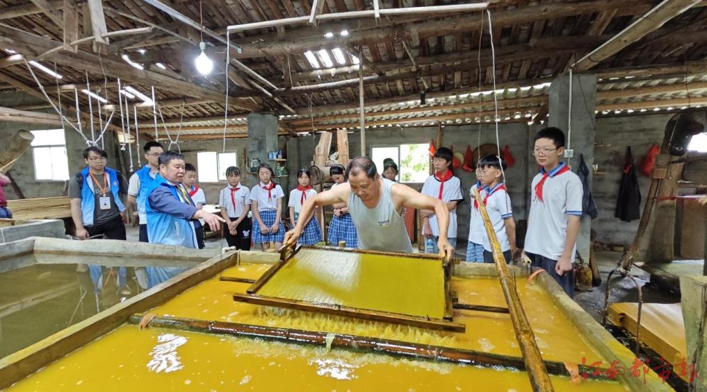 活動(dòng)于當(dāng)天上午10時(shí)正式拉開帷幕。江西省“四個(gè)100”文化導(dǎo)師、玉扣紙非物質(zhì)文化遺產(chǎn)代表性傳承人巫龍生化身“文化引路人”,向在場學(xué)生及導(dǎo)師團(tuán)隊(duì)詳細(xì)講述玉扣紙的古法制作流程。學(xué)生們紛紛圍聚在造紙池旁,全神貫注地觀察、體驗(yàn)紙漿沉淀、竹簾抄紙等工序,一招一式學(xué)得有模有樣,對這項(xiàng)古老技藝充滿好奇與探索的熱情。