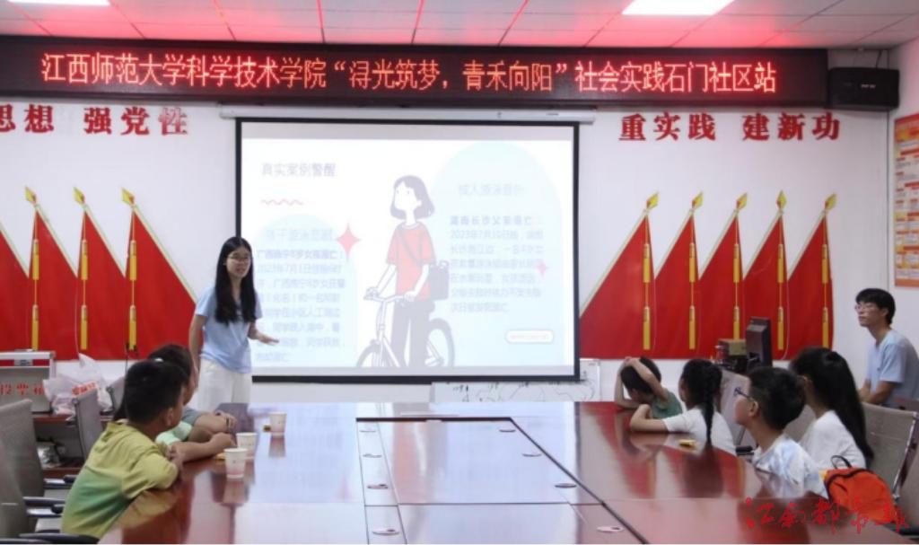 江南都市報(bào)訊 江媛、全媒體記者陳杰攝影報(bào)道:為切實(shí)筑牢暑期安全防線,提升社區(qū)兒童及家長防溺水與安全生產(chǎn)意識,7月2日,江西師范大學(xué)科學(xué)技術(shù)學(xué)院“潯光筑夢,青禾向陽”暑期社會(huì)實(shí)踐隊(duì)走進(jìn)九江市柴桑區(qū)石門社區(qū),開展了一場集知識性、互動(dòng)性、實(shí)踐性于一體的綜合安全宣講活動(dòng),吸引了眾多居民熱情參與,為社區(qū)平安度夏注入青春力量。