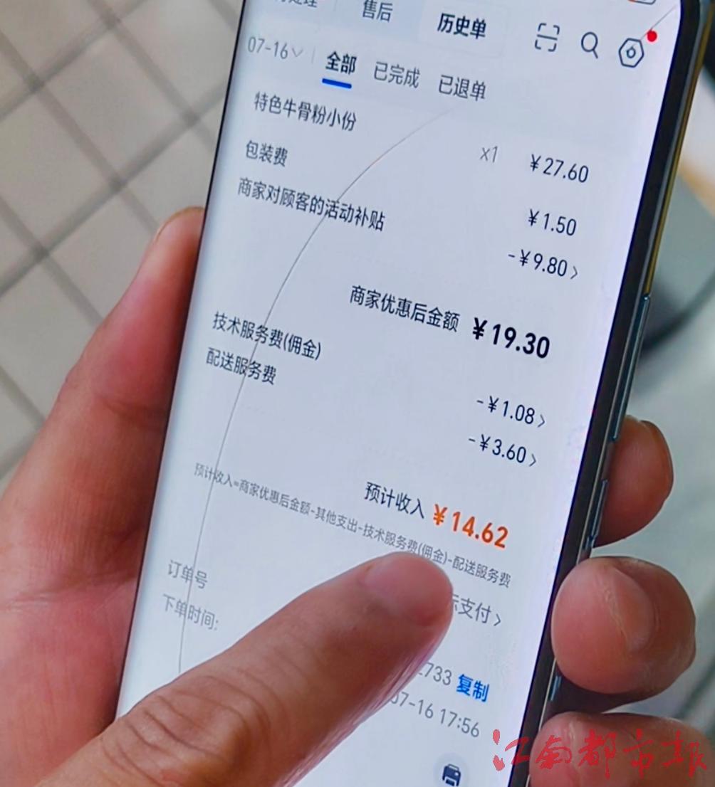 “這完全是薅商家羊毛,平臺(tái)拿商家的錢去補(bǔ)貼用戶!”紅谷灘萬(wàn)達(dá)金街一家牛骨粉店的老板給記者算了一筆賬:一份在外賣平臺(tái)標(biāo)價(jià)27.6元的牛骨粉,經(jīng)過(guò)各種滿減、打包費(fèi)和配送費(fèi)補(bǔ)貼,再扣除平臺(tái)傭金后,商家最終到手的收入僅15.14元。“刨除成本后一單只賺一兩元,幾乎沒(méi)利潤(rùn),配送地點(diǎn)遠(yuǎn)一點(diǎn)的話還可能虧本。”