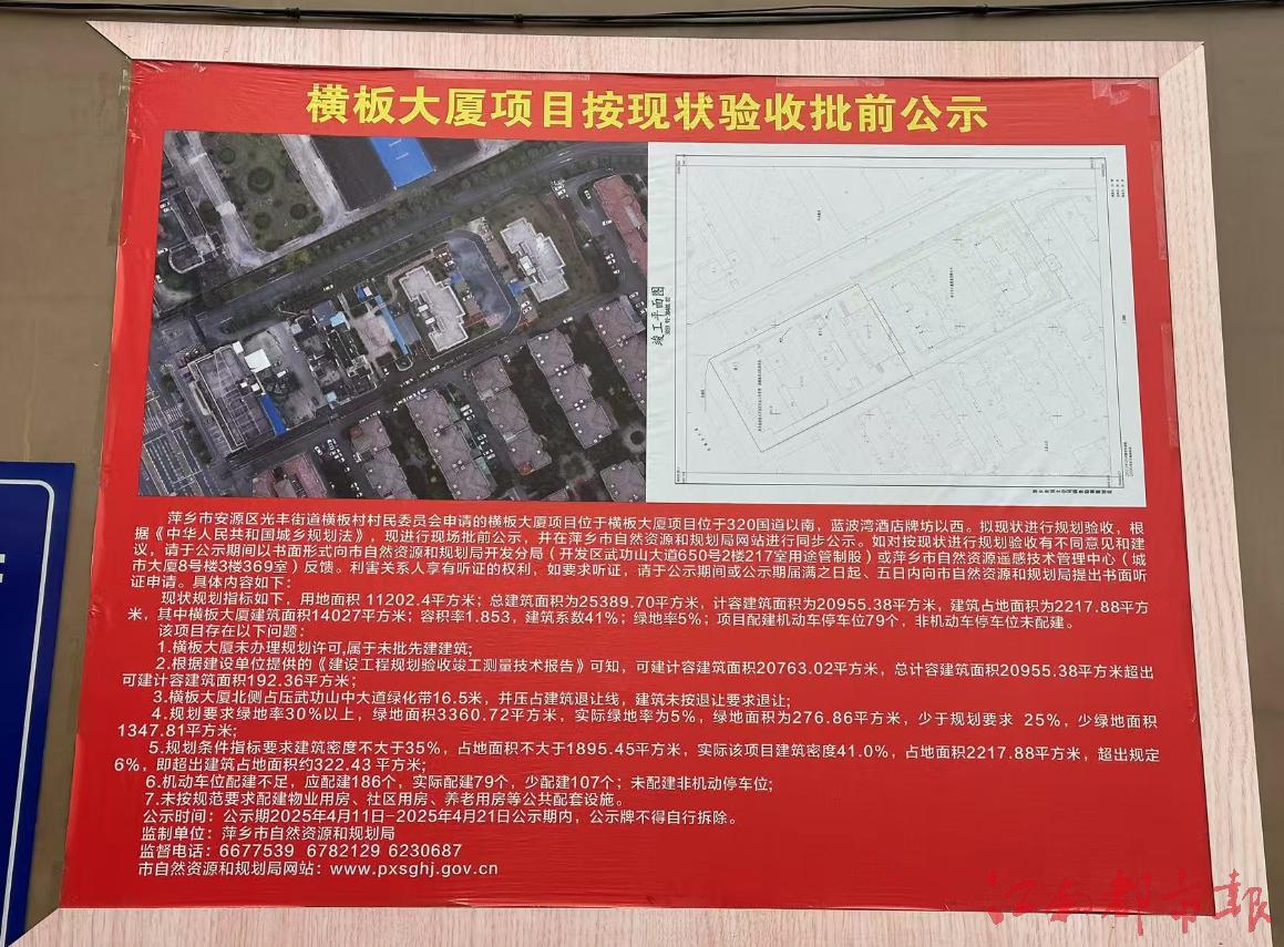 今年4月,萍鄉(xiāng)市自然資源和規(guī)劃局一則關(guān)于“橫板大廈項目按現(xiàn)狀驗收”的公示說明,引發(fā)關(guān)注。這棟位于萍鄉(xiāng)經(jīng)開區(qū)光豐街道橫板村的大廈,2015年7月竣工,如今欲通過“按現(xiàn)狀驗收”的方式“轉(zhuǎn)正”,引發(fā)公眾質(zhì)疑。