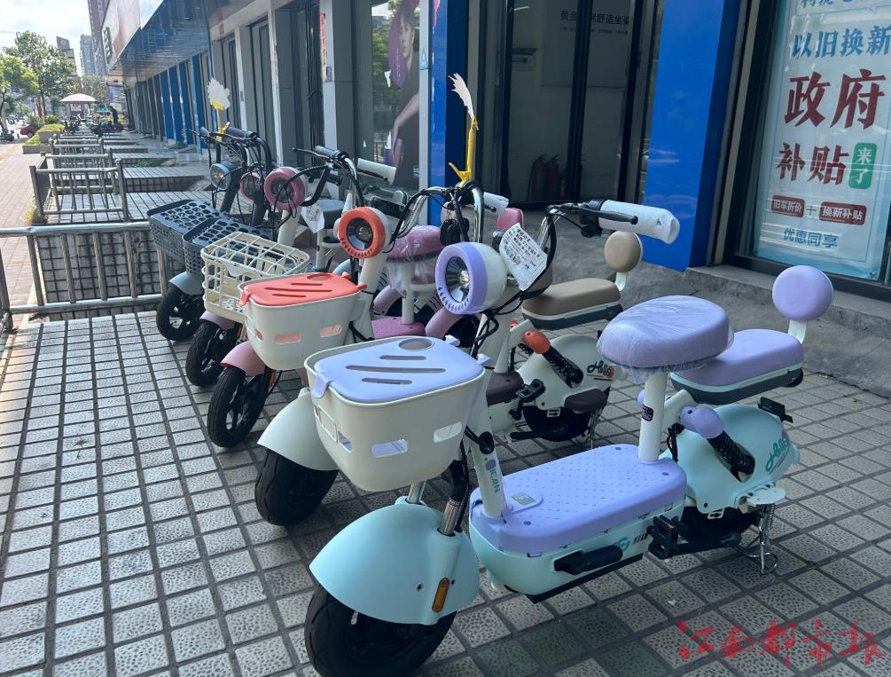 7月31日上午,記者來到南昌市洪城路,這里電動(dòng)自行車門店比較集中,時(shí)不時(shí)有顧客進(jìn)店詢問價(jià)格,店內(nèi)整齊擺放著嶄新的電動(dòng)自行車。記者注意到,大部分電動(dòng)自行車還是“舊國標(biāo)”產(chǎn)品,旁邊均張貼著寫有“以舊換新”“政府補(bǔ)貼”等字樣的宣傳廣告,基本所有門店均宣稱“以舊換新購買方式可以省500元至1000元”。