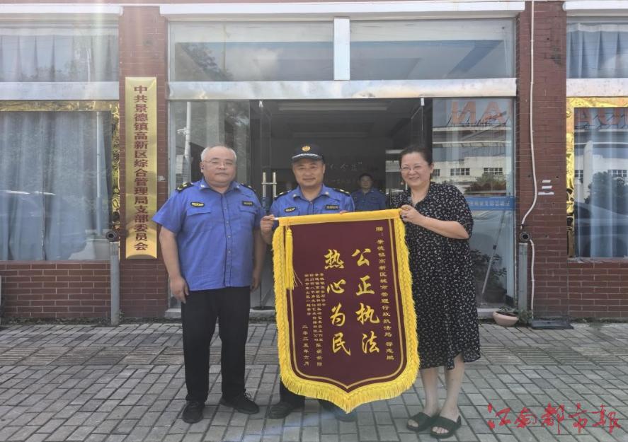 8月5日上午,景德鎮(zhèn)高新區(qū)新都民營(yíng)陶瓷園一期商鋪業(yè)主陳女士在其丈夫的陪同下,來(lái)到位于景德鎮(zhèn)高新區(qū)忠義路的景德鎮(zhèn)高新區(qū)綜合管理局駐地辦公樓門前,將一面寫有“公正執(zhí)法 熱心為民”字樣的錦旗交到景德鎮(zhèn)高新區(qū)綜合管理局分管領(lǐng)導(dǎo)的手中,口中不停地表示感謝。