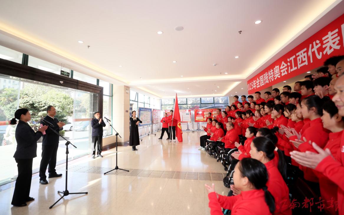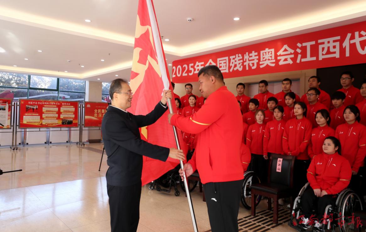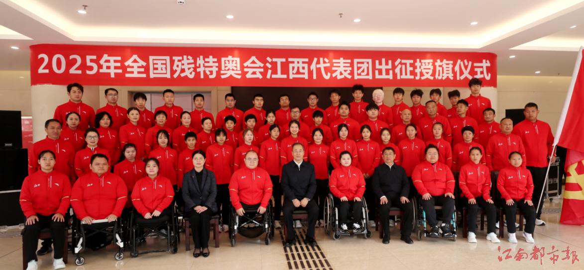 江南都市報(bào)訊 全媒體記者許南平攝影報(bào)道:11月25日,全國第十二屆殘運(yùn)會(huì)暨第九屆特奧會(huì)(以下簡稱“全國殘?zhí)貖W會(huì)”)江西代表團(tuán)出征授旗儀式在南昌舉行。省政府副省長、代表團(tuán)團(tuán)長孫洪山為代表團(tuán)授旗并講話。省教育廳、省體育局、省殘聯(lián)有關(guān)負(fù)責(zé)同志和部分教練員、運(yùn)動(dòng)員、領(lǐng)隊(duì)代表參加出征儀式。全國第十二屆殘運(yùn)會(huì)暨第九屆特奧會(huì)將于12月8日至15日在粵港澳三地舉辦。江西代表團(tuán)共337人,其中運(yùn)動(dòng)員226人,將參加舉重、田徑、跳繩等25個(gè)項(xiàng)目,涵蓋殘奧聾奧項(xiàng)目7個(gè)、大眾項(xiàng)目9個(gè)、特奧項(xiàng)目9個(gè)。在已結(jié)束的提前比賽項(xiàng)目中,江西代表團(tuán)斬獲跆拳道項(xiàng)目2金、2銅和四個(gè)第五名,創(chuàng)我省殘疾人跆拳道項(xiàng)目自建隊(duì)以來的最佳戰(zhàn)績,為后續(xù)賽事奠定堅(jiān)實(shí)基礎(chǔ)。