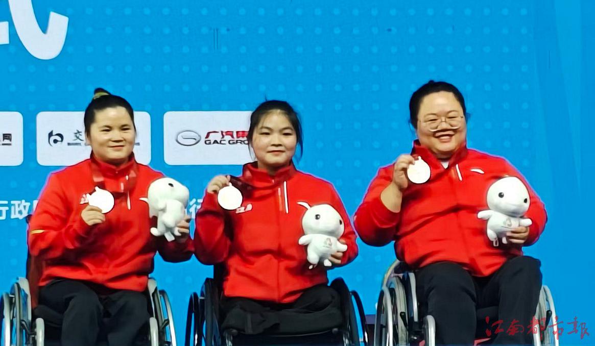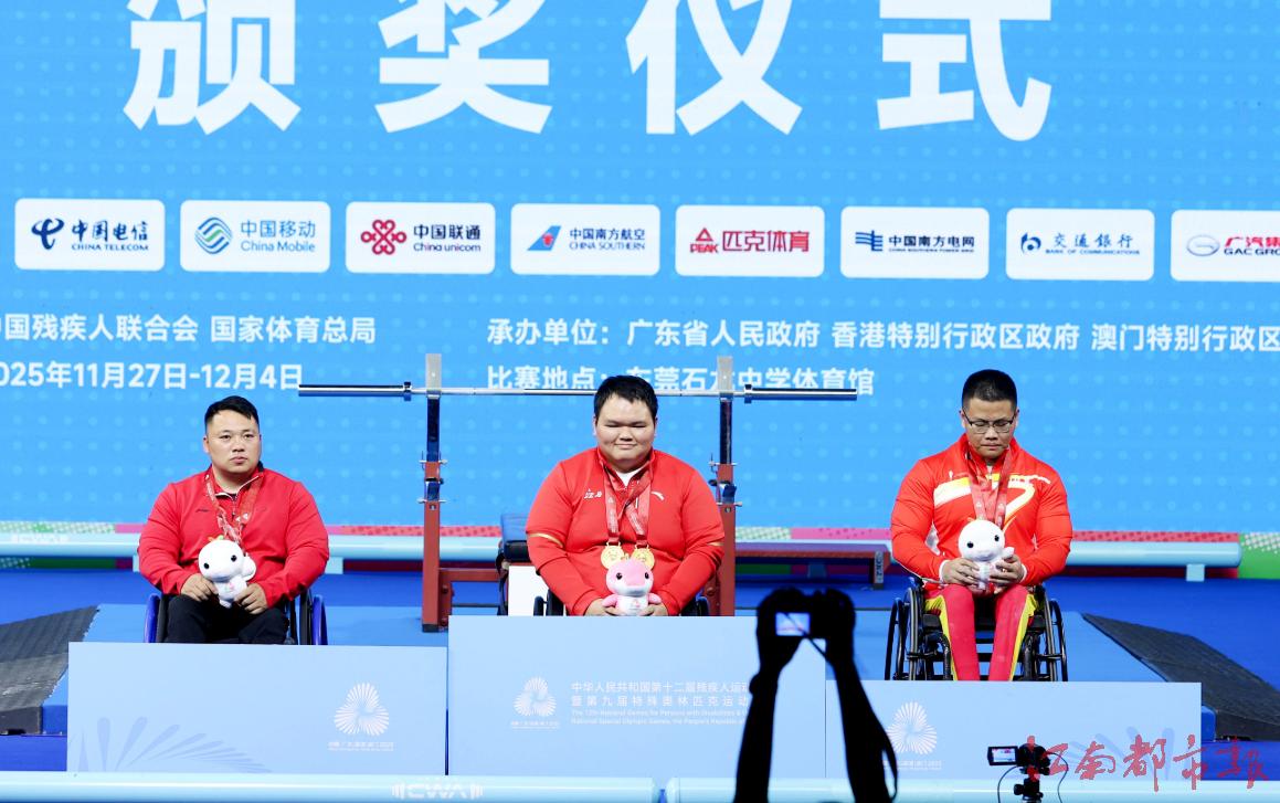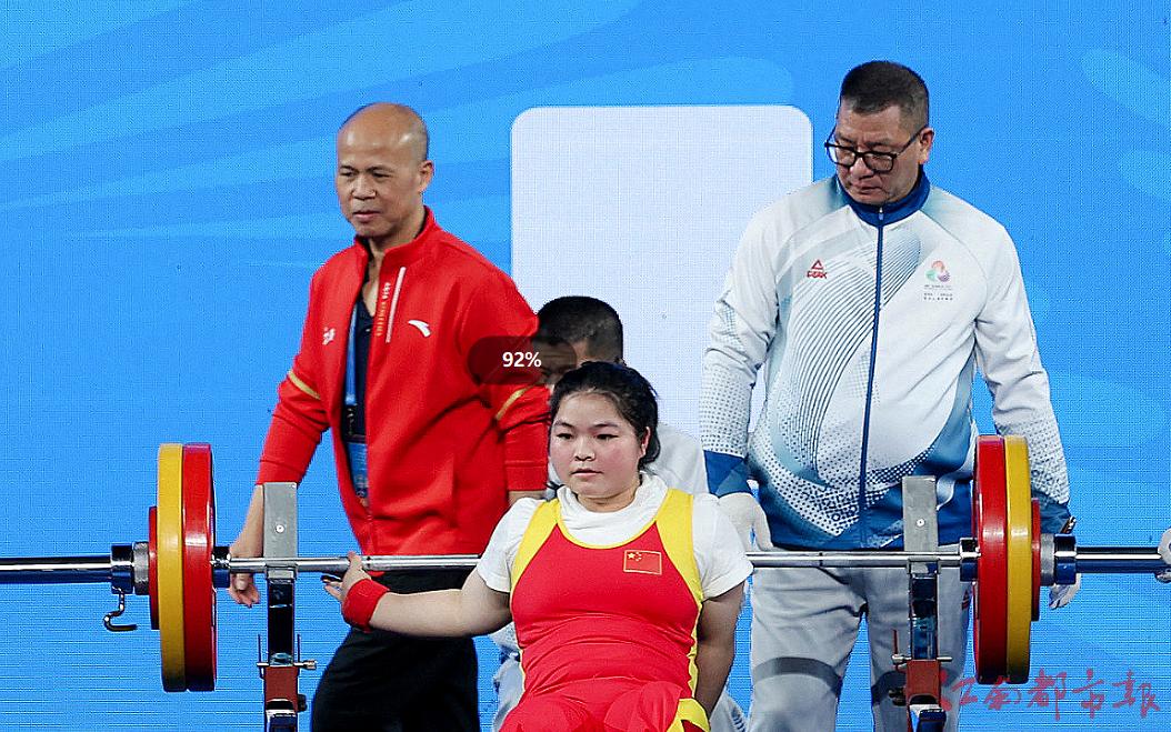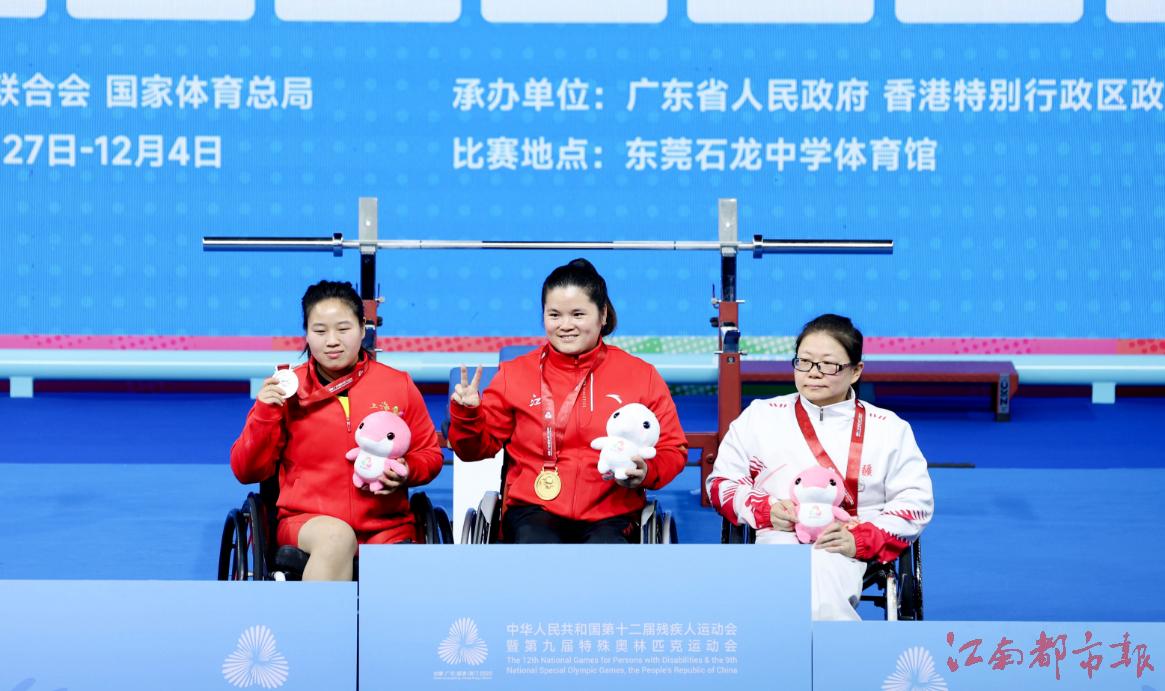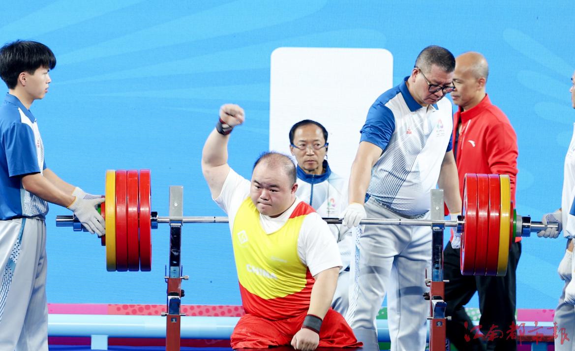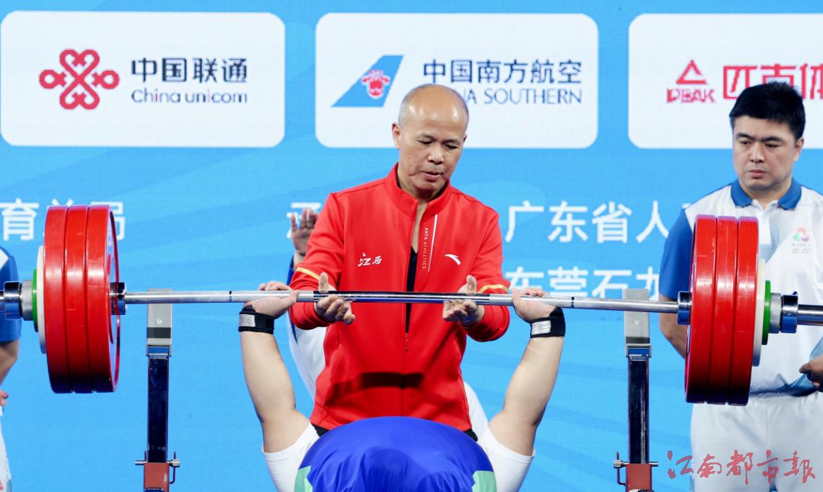 江南都市報訊 全媒體特派記者許南平攝影報道:12月8日,全國第十二屆殘運會暨第九屆特奧會在廣州開幕,在率先進行的殘運會跆拳道、賽艇和舉重項目的比賽中,江西代表團全體運動員秉持 “勇氣、決心、超越”的殘?zhí)貖W會運動精神,在賽場上全力以赴、奮勇拼搏,已收獲競技項目9金5銀7銅的好成績。運動員朱文軍在舉重比賽中,憑借161公斤的個人最佳重量與436公斤的總重量,斬獲女子86公斤以上級2枚金牌,并以 161 公斤的優(yōu)異成績,成功打破該級別160.5公斤全國紀錄!9日開始,各項賽事將全面開打,期待我省健兒捷報頻傳。