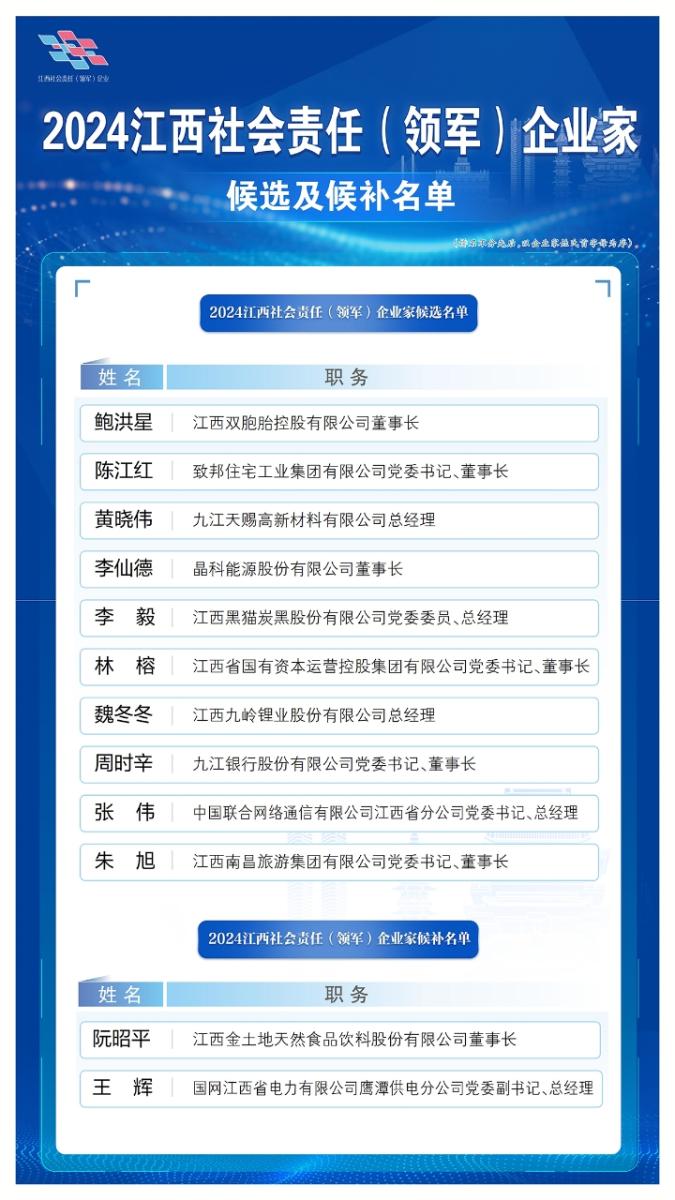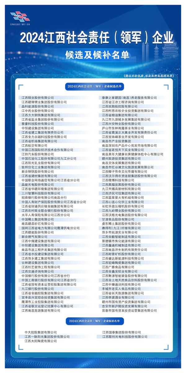 12月16日,2024江西社會(huì)責(zé)任(領(lǐng)軍)企業(yè)(企業(yè)家)候選及候補(bǔ)名單出爐,